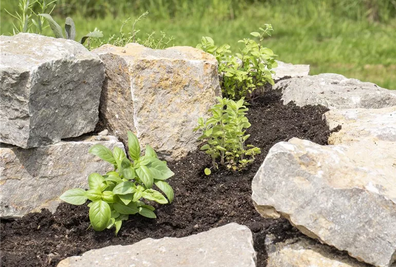 Eine Kräuterspirale lässt sich in vier Zonen aufteilen. Die unterste Zone ist für Kräuter geeignet, die es feucht mögen und auch einmal nasse Füße vertragen können. In diese Zone sollte man eine Mischung aus 50 Prozent Gartenerde und 50 Prozent Kompost ausbringen. Hier fühlen sich Brunnenkresse und Wasserminze wohl. Die zweite Zone ist ebenfalls eine eher feuchte Zone, deren Substrat aus 50 Prozent Gartenerde, 20 Prozent Sand und 30 Prozent Kompost bestehen sollte. Sie ist ideal für Pflanzen wie Bärlauch, Estragon, Basilikum, Dill, Melisse, Petersilie und Liebstöckel. In der dritten Zone gedeihen die meisten Minzarten, Schnittlauch, Koriander, Kapuzinerkresse, Borretsch und ähnliche Kräuter am besten. Sie sollte mit einem Gemisch aus 50 Prozent Gartenerde, 30 Prozent Sand und 20 Prozent Kompost aufgefüllt werden. Der obere Bereich ist den mediterranen Kräutern vorbehalten, die es warm und trocken mögen. In der Erde aus 50 Prozent Gartenerde und 50 Prozent Sand gedeihen Currykraut, Lavendel, Oregano, Thymian, Rosmarin, die meisten Salbeiarten, Majoran, Lorbeer und weitere mediterrane Kräuter bestens.