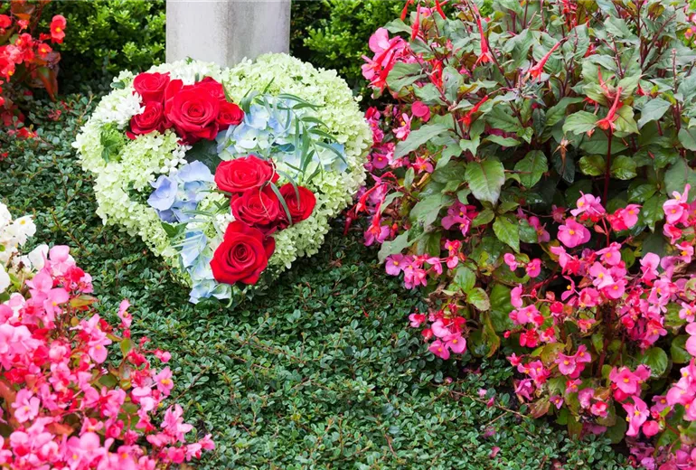 Wichtig ist, dass die Grabbepflanzung für den Sommer vor dem großen Hitzeeinbruch erfolgt. Nur dann haben die Pflanzen noch genug Zeit, sich tief einzuwurzeln und damit resistent gegen die anhaltende Hitze zu werden. Generell ist besonders im Sommer regelmäßiges Gießen und Düngen auf dem Grab notwendig, damit die Blumen prächtig und gesund wachsen. Ein Grab sollte aber niemals eine Belastung für die Hinterbliebenen sein, sondern die Möglichkeit, den Verstorbene nahe zu sein und an sie zu denken. Deshalb sollte man auf eine sehr pflegeleichte Grabbepflanzung zurückgreifen, die nicht viel Arbeit macht. Mehrjährige Pflanzen verringern die Pflanzarbeiten und Bodendecker reduzieren das Unkraut auf dem Grab. Blühende Pflanzen geben dem Grab dann eine saisonale Note.