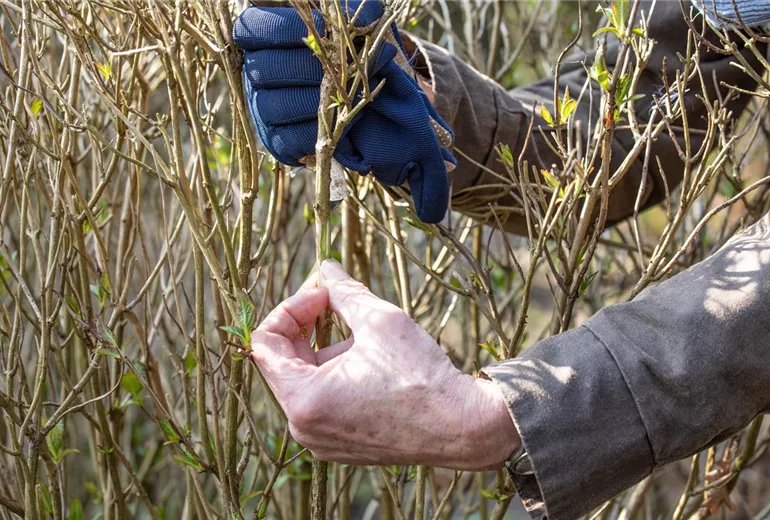 Entfernt man die alten Blütenstände im Frühling, kann die Pflanze ihre ganze Kraft in die Bildung neuer Triebe stecken. Geschnitten wird deshalb oberhalb eines gesunden und grünen Knospenpaares. Das Entfernen der alten Blütenstände kann man dann auch direkt als Anlass nehmen, die Pflanze von abgestorbenen oder erfrorenen Trieben zu befreien. Wer sich unsicher ist, ob ein Trieb noch lebt oder schon abgestorben ist, kann einfach leicht an der Rinde kratzen. Ist der Trieb unter der Rinde noch grün, lebt der Ast. Ist das Gewebe unter der Rinde allerdings trocken und faserig, kommt für diesen Zweig jede Rettung zu spät. Er kann und sollte abgeschnitten werden. Das hat nicht nur gesundheitliche Gründe, die Pflanze wächst dadurch auch ästhetischer und buschiger weiter.