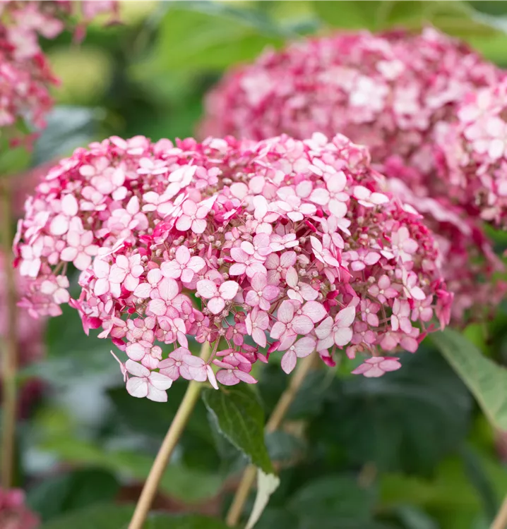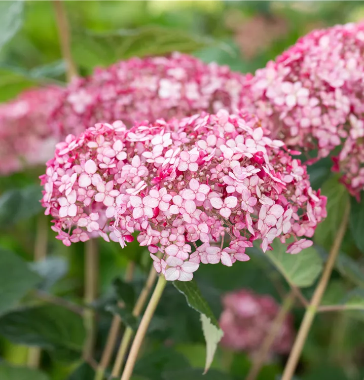 Die Ballhortensie 'Sweet Annabelle'® (Hydrangea arborescens) ist ein Strauch, der hellrosafarbene, radförmige, in Dolden angeordnete Blüten hervorbringt. Sie erscheinen von Juli bis September. Zudem trägt die Ballhortensie 'Sweet Annabelle'®, eiförmige, dunkelgrüne Blätter. An einem sonnigen bis halbschattigen Standort mit durchlässigem, humosem, saurem Boden erreicht sie gewöhnlich eine Höhe von ca. 3 m und wird ca. 2 m breit.