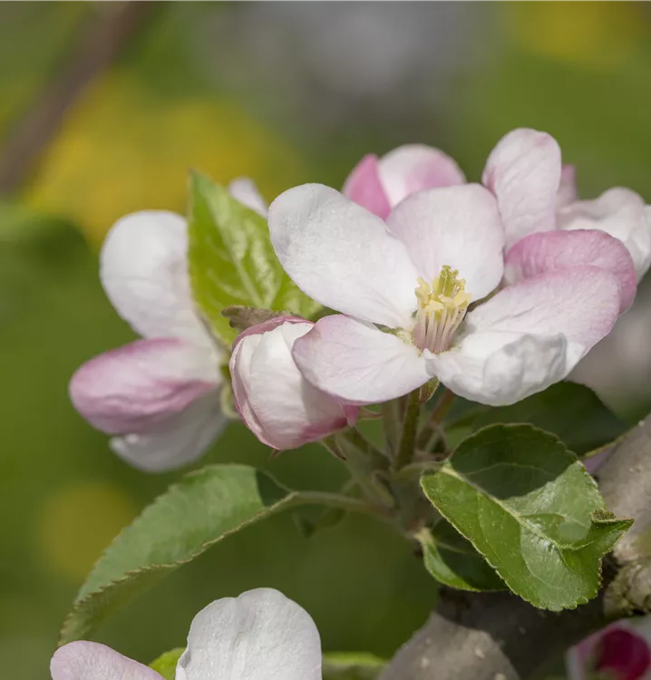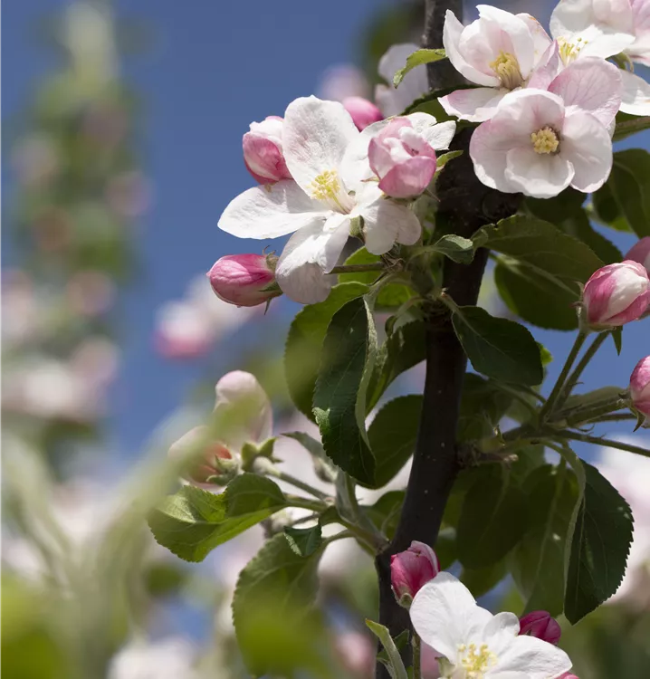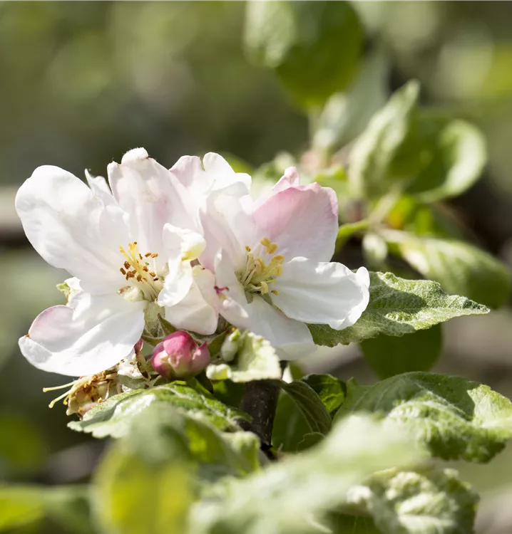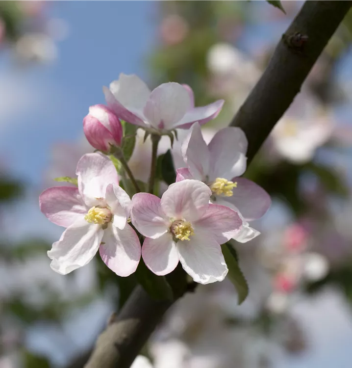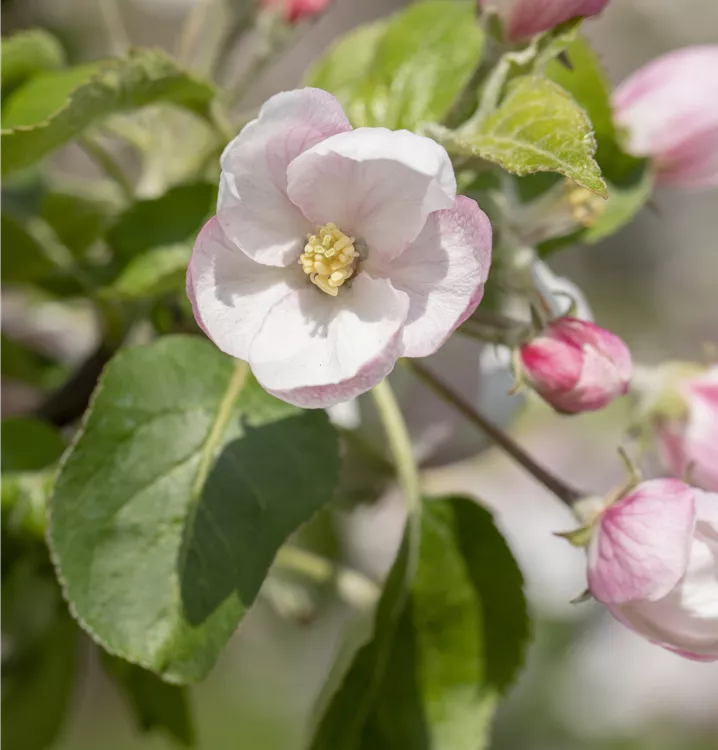 Malus domestica 'Landsberger Renette' bildet hellrosafarbene Blüten ab April.