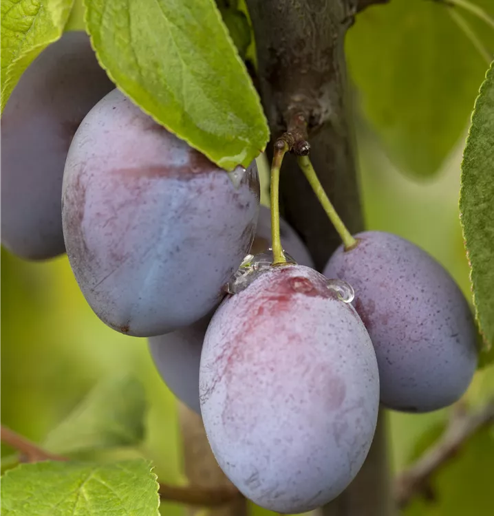 Die Zwergzwetsche 'Jojo' (Prunus domestica) bildet blaue, mittelgroße, feste Früchte. Sie haben einen süßen, aromatischen Geschmack. Für eine ertragreiche Ernte ab September schaffen durchlässiger, humoser Boden und ein sonniger bis halbschattiger Standort optimale Bedingungen. Ihre weißen Blüten sind eine schöne Erscheinung. Die Zwergzwetsche 'Jojo' wird mit ihrem buschigen, aufrechten und breiten Wuchs etwa 3 m hoch und 6 m breit.