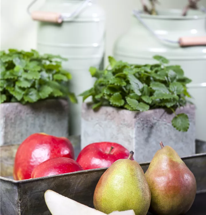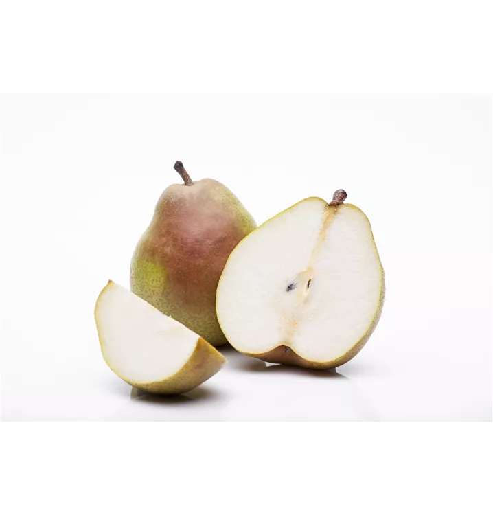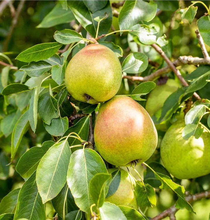 Die Winterbirne 'Vereins Dechantsbirne' (Pyrus communis) bildet gelb-grüne, sehr große Früchte. Sie haben einen süß-säuerlichen Geschmack. Für eine ertragreiche Ernte ab Oktober schaffen lockerer, lehmiger Boden und ein sonniger bis halbschattiger Standort optimale Bedingungen. Ihre weißen Blüten sind eine schöne Erscheinung. Die Winterbirne 'Vereins Dechantsbirne' wird mit ihrem kegelförmigen, aufrechten und verzweigten Wuchs etwa 4 m hoch und 3 m breit.